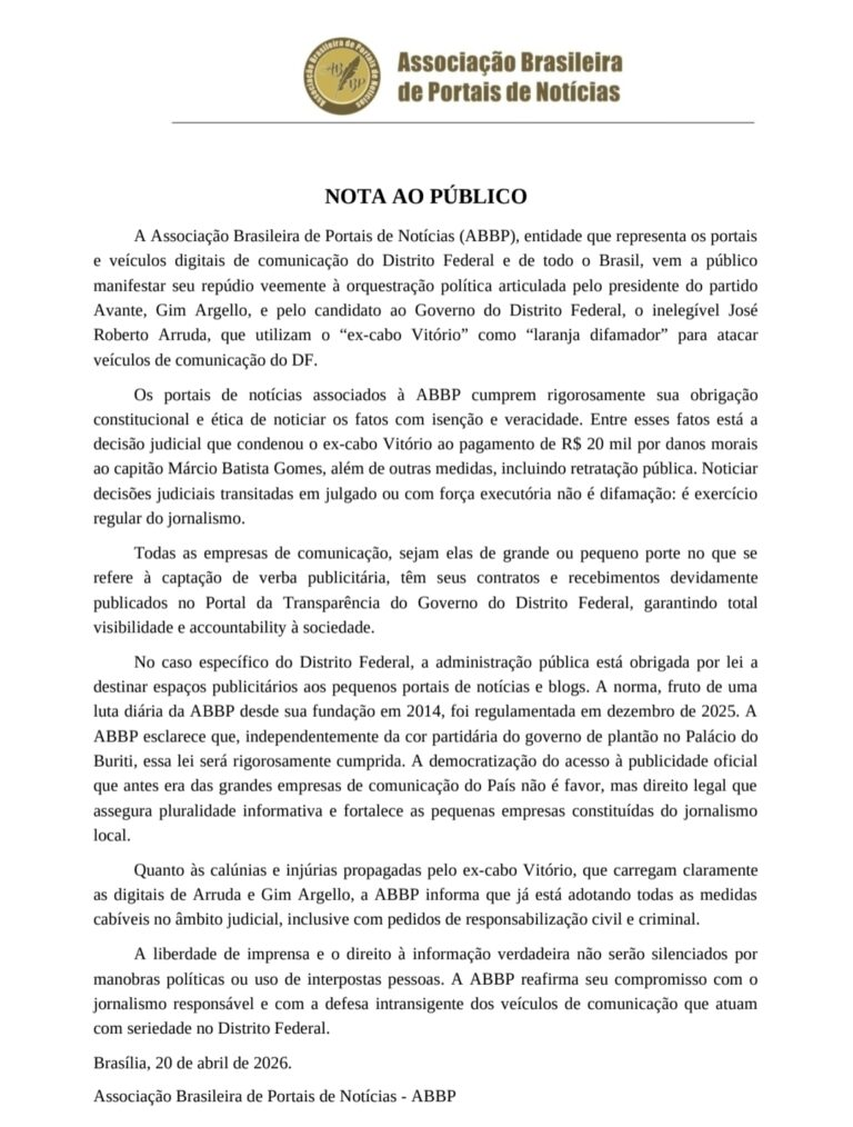 A Associação Brasileira de Portais de Notícias (ABBP) divulgou, nesta segunda-feira (20), uma nota pública em que manifesta repúdio a ataques direcionados a veículos de comunicação do Distrito Federal. A entidade aponta a existência de uma articulação política envolvendo lideranças partidárias e o uso de terceiros para tentar descredibilizar o trabalho da imprensa local.