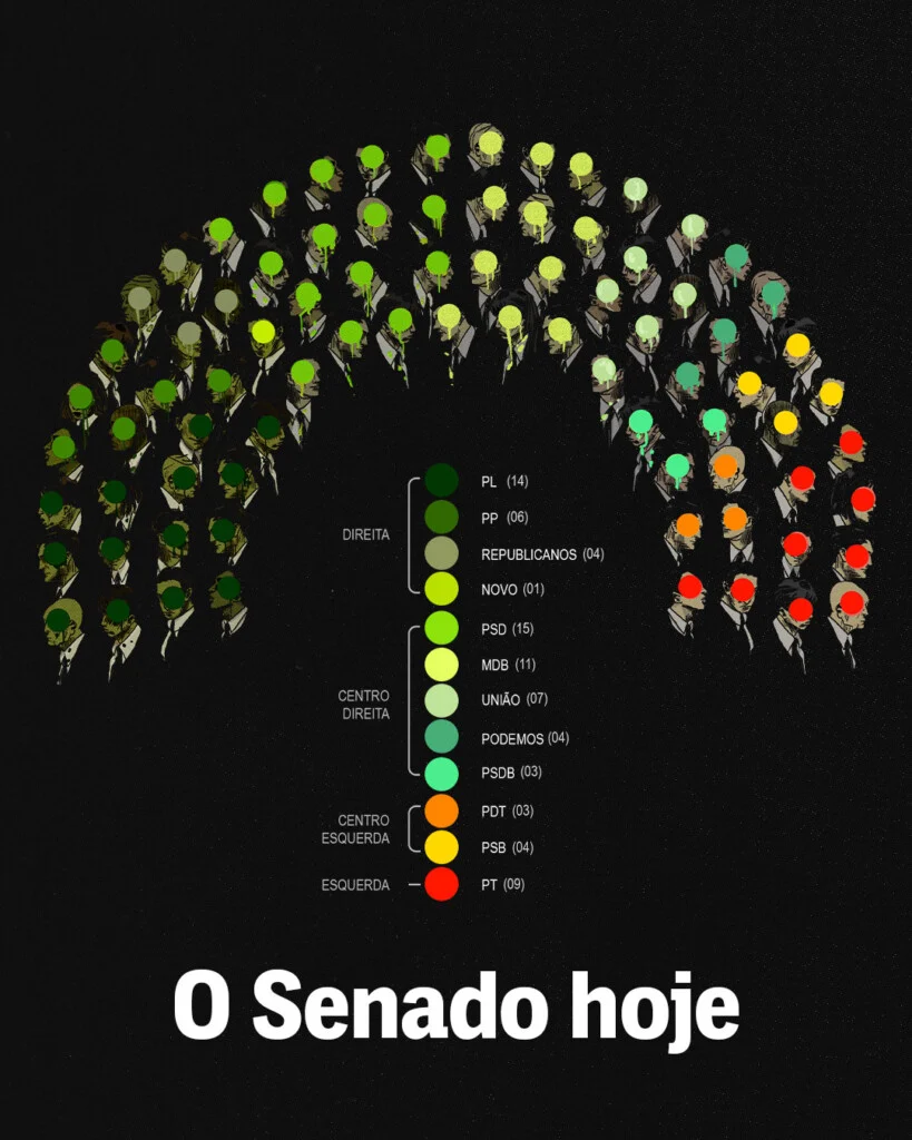 No cálculo do Planalto, a direita não pode eleger 24 senadores, sob risco de mudar o equilíbrio da Casa. Atualmente, a esquerda ocupa 28 cadeiras, sendo que 21 estarão em disputa neste ano. Para garantir maioria sem depender do Centrão, o desafio é manter os mandatos atuais e conquistar mais 13 vagas, totalizando 34 cadeiras.