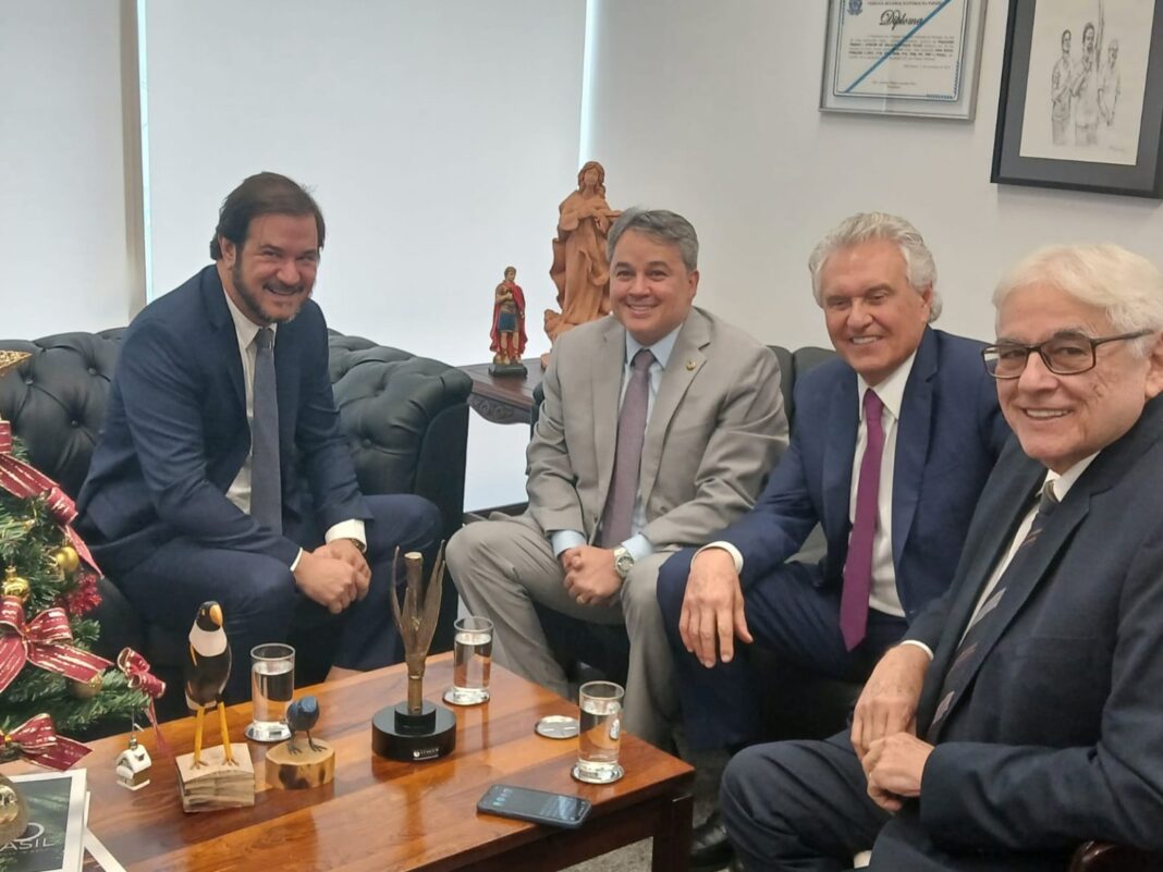 Entre os compromissos do dia, Ronaldo Caiado também se reuniu com o presidente do União Brasil, Antonio Rueda, no gabinete do senador Efraim Filho (PB), antes do almoço entre os governadores.