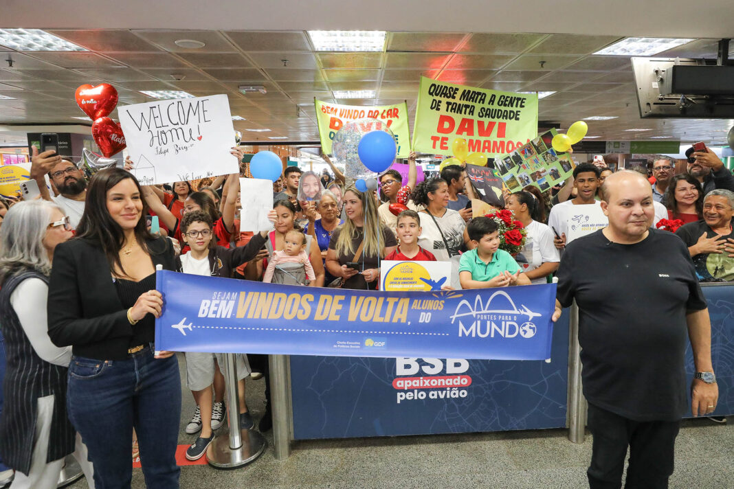 O Governo do Distrito Federal recebeu, neste fim de semana, o último grupo de alunos que participou da primeira edição do Pontes para o Mundo, programa de intercâmbio que levou estudantes da rede pública para uma imersão de 17 semanas no Reino Unido. O governador Ibaneis Rocha e a primeira-dama Mayara Noronha Rocha acompanharam de perto a chegada dos jovens no Aeroporto Internacional de Brasília, marcando o encerramento da etapa inaugural da iniciativa.
